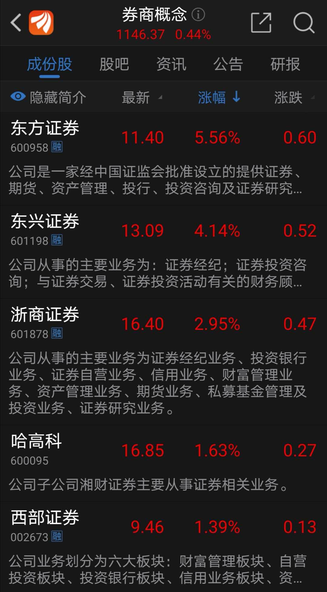 截至午盘,东方证券涨5.56%,为板块内涨幅最高个股。东兴证券(+4.14%)、浙商证券(+2.95%)等跟涨。海通证券涨0.92%、国泰君安涨0.77%。