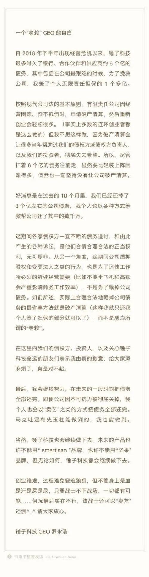 几日后,罗永浩发了题为《一个“老赖”CEO的自白》的长文,回应成为“老赖”一事,并透露了锤子科技的负债情况。