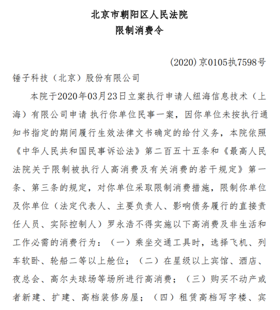 值得一提的是,就在2020年还债期间,罗永浩还接到其它执行裁定。2020年4月,罗永浩收到了北京朝阳人民法院的限制消费令,因申请人纽海信息技术(上海)有限公司申请执行,锤子科技及公司实控人罗永浩被限制高消费。