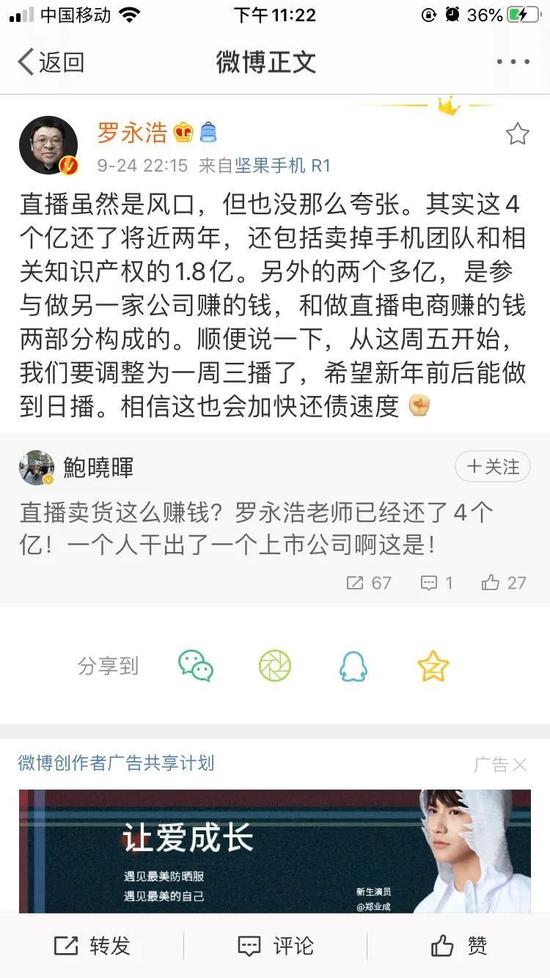 随后,9月24日晚10点,罗永浩在其微博澄清,“直播虽然是风口,但也没那么夸张。其实这4个亿还了将近两年,还包括卖掉手机团队和相关知识产权的1.8亿。另外的两个多亿,是参与做另一家公司赚的钱,和做直播电商赚的钱两部分构成的。”