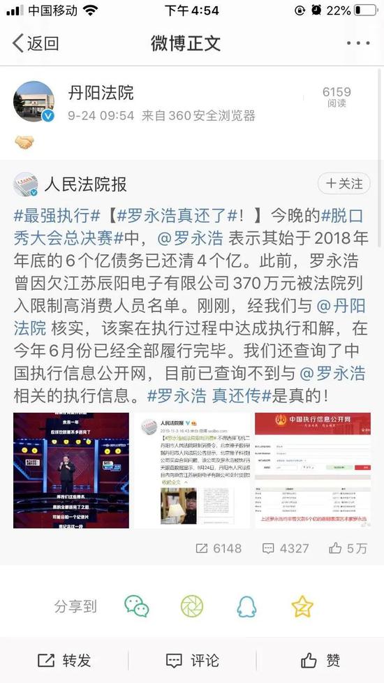 中国执行信息公开网显示,目前已经查询不到罗永浩关于丹阳法院的执行案件。《人民法院报》官方微博称,经与丹阳法院核实,该案在执行过程中达成执行和解,在今年6月份已经全部履行完毕。