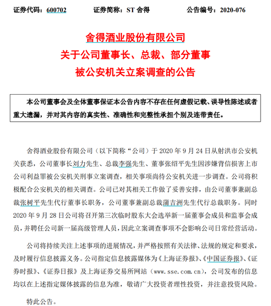 舍得酒业表示,将积极配合公安机关的相关调查,已对其相关工作做了妥善安排,由公司董事兼副总裁张树平代行董事长职务,公司董事兼副总裁蒲吉洲先生代行总裁职务。同时9将于9月28日召开第三次临时股东大会选举新一届董事会成员和监事会成员,并聘任公司新一届高级管理人员,因此立案调查事项不会影响公司日常经营活动。同时,舍得酒业还发布2020年第三次临时股东大会取消议案的公告表示。