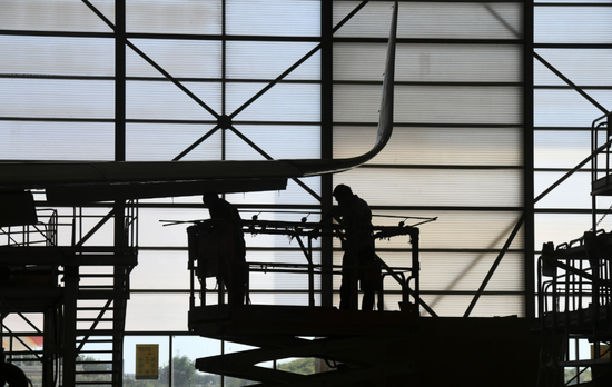 9月17日,天津海特飞机工程有限公司工作人员在机库内进行维修作业。近年来,天津自贸区已聚集了一批高端航空维修企业,成为亚太地区重要的高端维修和检测基地。新华社发(赵子硕摄)