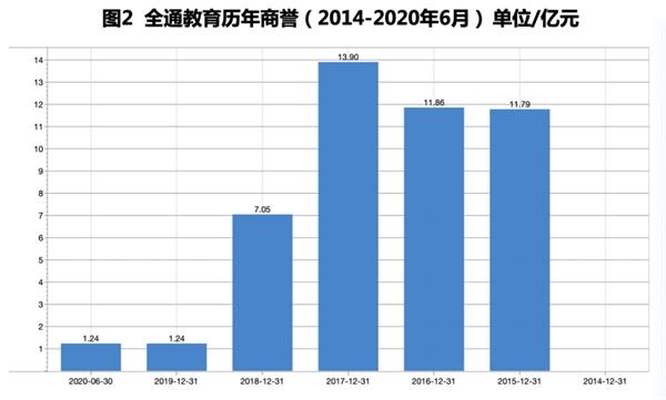 根据其历年商誉(见图2)不难发现,仅2015年,全通教育并购了9家公司,带给其近11.8亿元的商誉。2018年及2019年,全通教育因计提巨额商誉减值,业绩连续巨亏。2019年年末商誉余额较年初减少了82.48%,当期年报中坦承,“经营出现亏损主要是以商誉减值为主的资产减值损失所致”。