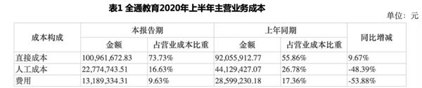 对于这份归母和扣非双双扭亏为盈的半年报,全通教育解释称,一方面,受疫情影响,继续教育业务主要开展线上培训,与原面授培训联系较为紧密的培训会议费、培训资料费以及劳务费等成本有较为显著的下降,毛利率大幅增长,以及上半年人工费用、市场费用、行政费用等同比均有所减少(见表1)。
