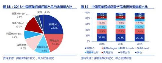 据第三方机构弗若斯特沙利文的数据,2018年,华熙生物、昊海生科与爱美客的玻尿酸市场销售额占率分别为6.6%、7.2%和7.2%,合计21%。反观韩国、美国、瑞典品牌,销售额占比却高达70%。