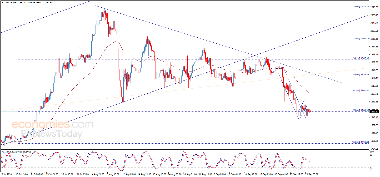 根据Economies.com,假如金价有效跌破关键支撑1860.90美元/盎司,这将令金价承压并进一步大幅下挫。因此,金价今日收盘能否收在1860.90美元/盎司上方将相当重要,一旦收盘跌破这一水平,这将确认金价跌破1860.90美元/盎司。