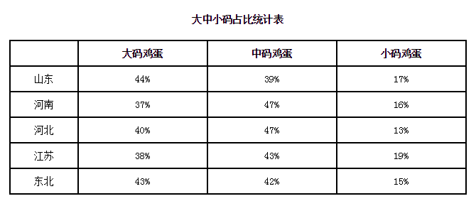 5月份鸡苗销量环比减少17.21%,因此进入下旬后新开产蛋鸡数量逐渐减少,小码鸡蛋占比小幅增加。但随着气温降低,蛋重上涨较快,且新开产蛋鸡数量仍呈减少趋势,后期小码占比或小幅下降,大码鸡蛋占比或逐渐增加,中码鸡蛋占比减少。截至9月25日,主产区大、中、小码鸡蛋占比如下表所示。