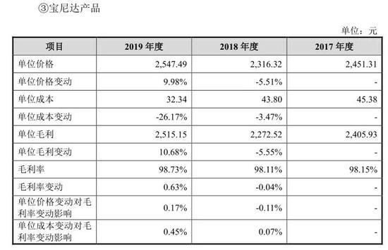 那么,爱美客为何会有如此高昂的毛利率呢?从其产品的单位成本中可以窥见一二。从其毛利率最高的宝尼达来看,2019年,其单位价格由2018年的2316.32元增长9.98%至2019年的2547.49元,而单位成本则由2018年的43.80元下降26.17%至2019年的32.34元,而这也导致了宝尼达的毛利率由2018年的98.11%增至98.73%。