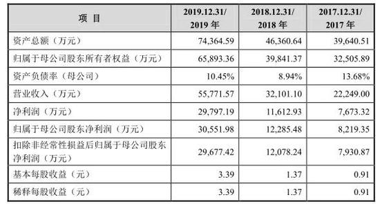 招股书显示,2017-2019年,爱美客的营收分别为2.22亿元、3.21亿元、5.58亿元;归属于母公司股东净利润分别为8219.35万元、1.23亿元、3.06亿元。