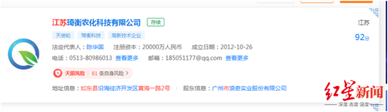 有意思的是,广州浪奇给鸿燊“推荐”的这个瑞丽仓,地址为“江苏省南通市如东县黄海一路2号”。而以此地址在天眼查APP查询,广州浪奇旗下一家名叫“江苏琦衡农化科技有限公司”的子公司,地址竟与该址完全一致。