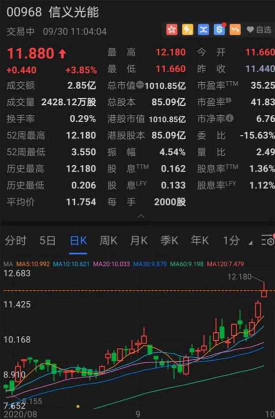 港股光伏板块同步拉升,多只个股再创上市后新高。光伏玻璃龙头信义光能一度涨6.5%,最高触及12.18港元/股,再创上市以来新高。信义系主营光伏电厂的信义能源亦一度涨至4.03港元/股再创新高。
