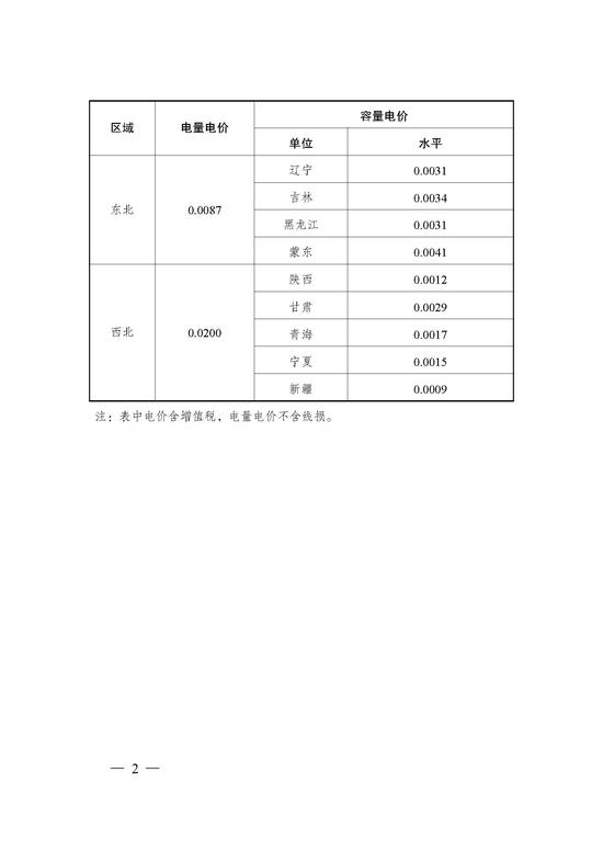 一、华北、华东、华中、东北、西北区域电网第二监管周期(2020年1月1日~2022年12月31日)两部制输电价格水平详见附件。其中,电量电价随区域电网实际交易结算电量收取;容量电价随各省级电网终端销售电量(含市场化交易电量)收取;京津唐电网范围内,位于北京、天津、河北境内的电厂参与京津唐地区交易电量不纳入华北电网电量电费计收范围。