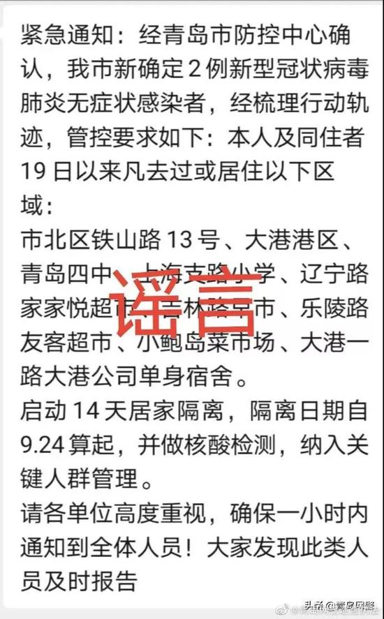 9月26日,@青岛网警巡查执法通报:“网传信息为青岛某公司内部防疫措施,是企业内部通知,此信息后流入互联网引发网民误会,请大家不信谣、不传谣。”