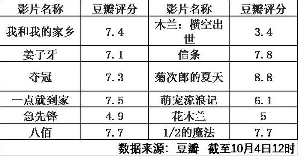 目前热映的国庆档影片口碑分化严重。根据豆瓣评分,国庆档上映的十余部影片评分大致维持在7.0-8.0区间范围,国产影片中《八佰》评分最高,达到7.7分。《一点就到家》《我和我的家乡》分居二三位,国产动画电影《木兰:横空出世》反响平平,仅获3.4分。