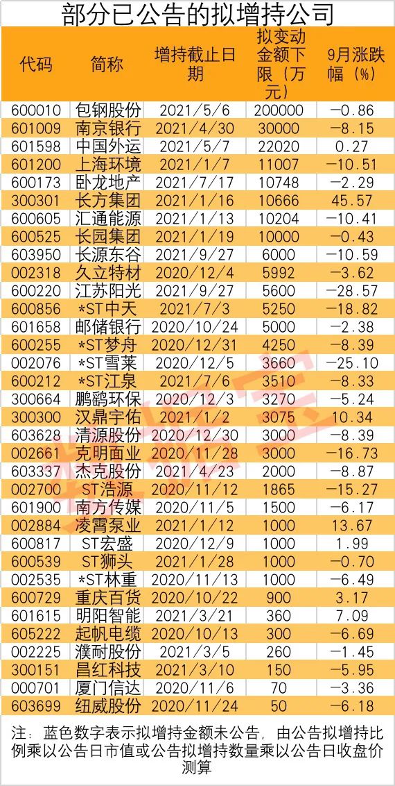 股价表现上,多数发布了拟增持计划的个股近期走势偏弱。上述35股中仅有7股9月股价上涨,除“爆炒股”长方集团外,凌霄泵业和汉鼎宇佑9月累计涨幅超过10%。江苏阳光、*ST雪莱9月下跌超20%。