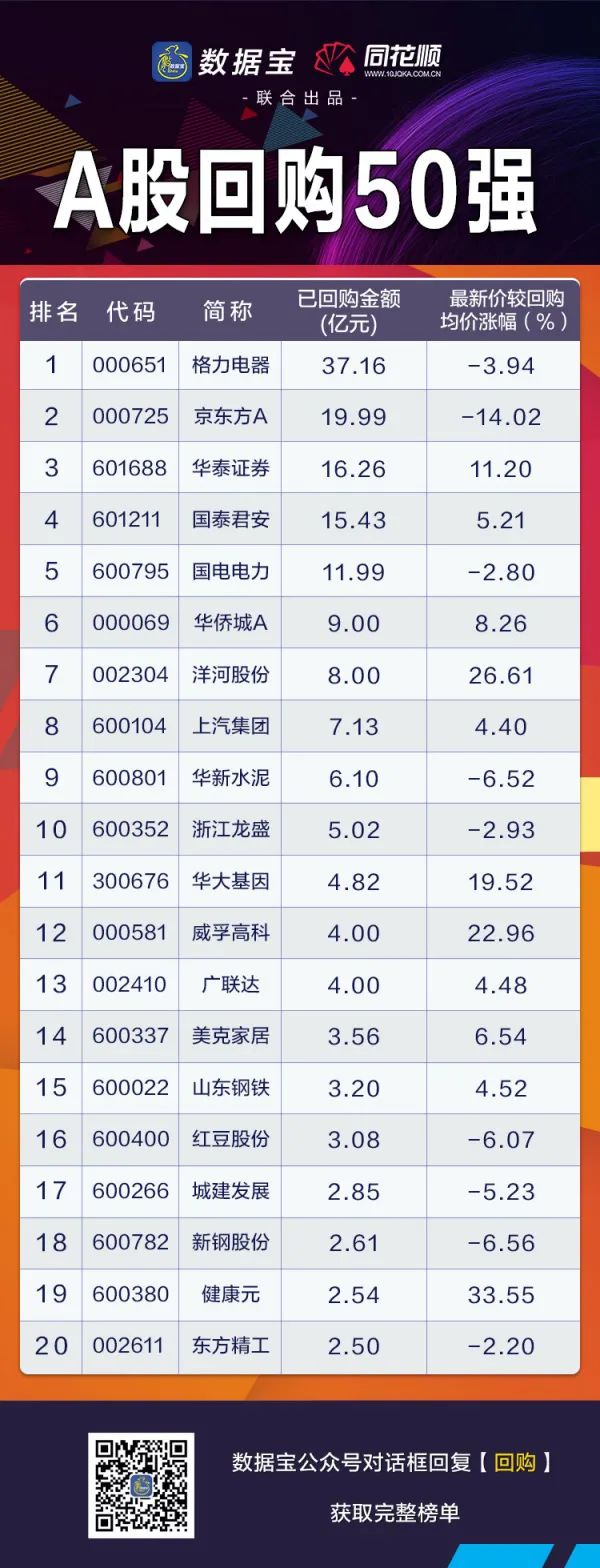 53家回购金额过亿的公司中,25家公司最新价低于回购均价,鹏鹞环保、恒力石化最新价较回购价跌幅最多。众信旅游、三棵树、慈星股份回购以来股价涨幅最大,最新价较回购均价涨幅超过50%。