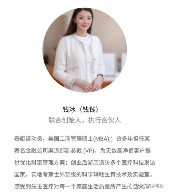 钱冰女士气质很好,看简历是财富管理行业出身,不是一些大V传的做并购的,渠道募资为主,现在名下有一家助孕公司。性质一样,都是做的富人生意。