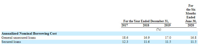 截至2020年6月30日,无抵押贷款的年均名义借款成本为16.8%,有抵押借款的年均名义借款成本为11.5%。自2020年9月开始,陆金所所有新增贷款的名义借贷成本约为13.7%。