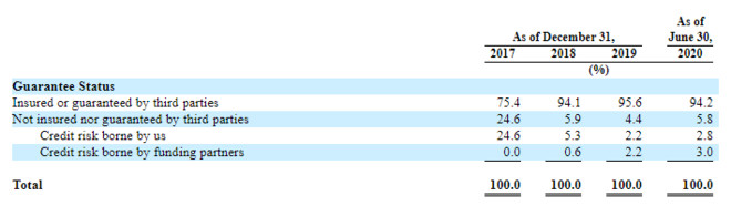 自2017年以来,由第三方提供担保的贷款比例总75.4%增长到了95%左右。截至2020年上半年,公司自身的信用敞口风险占比仅为2.8%。