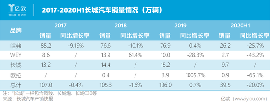 2020年,长城汽车的销量似乎愈发尴尬。上半年累计销量为39.5万辆,同比大降20%。除去车市寒冬、疫情等影响因素外,长城汽车销量的背后更是暗藏不少危机。