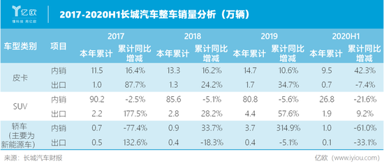 从内销来看,在今年上半年中,长城皮卡累计销量为9.5万辆,同比增长42.3%,成为该公司唯一一个同比正增长的车型类别。多重因素影响下,拯救长城汽车销量的并非魏建军最相信的“SUV”,反而是皮卡业务在困难时期给予了长城汽车强有力支持。