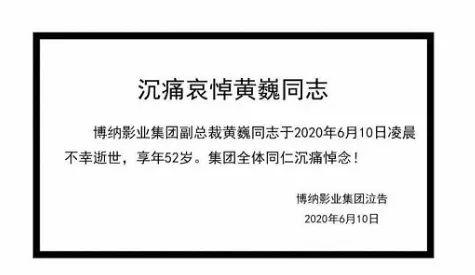 2020年6月10日下午,微信公号“博纳影业集团”发布消息称,博纳影业集团副总裁黄巍同志于6月10日凌晨不幸逝世,享年52岁。