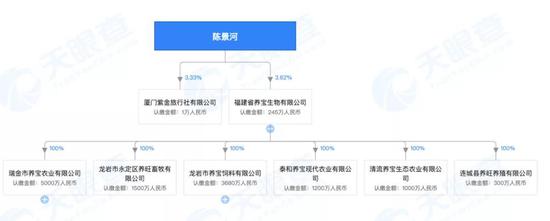 事实上,陈景河的财富远不止于此。天眼查显示,陈景河参股两家公司,分别是厦门紫金旅行社有限公司和福建省养宝生物有限公司,后者旗下控股6家与农业和畜牧相关的公司,累计认缴金额过亿元。