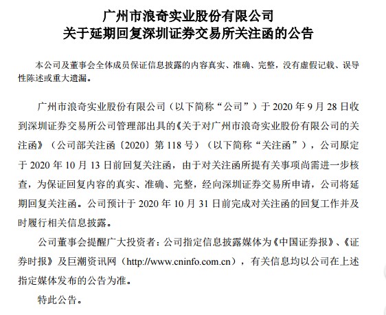 根据广州浪奇的公告显示,原定于9月30日回复深交所关注函。公司以“对关注函所提有关事项尚需进一步核查”为由,又将关注函回复推迟至10月15日。而10月10日,公司再次发布了关于延期回复深圳证券交易所关注函的公告,公告称公司预计于 2020 年 10 月 31 日前完成对关注函的回复工作并及时履行相关信息披露。