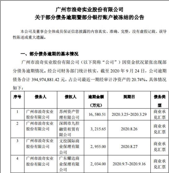 9月24日晚间,广州浪奇,公司因资金状况紧张出现部分债务逾期情况。经公司财务部门统计核实,截至2020年9月24日,公司逾期债务合计394,974,881.42元,占公司最近一期经审计净资产的20.74%。