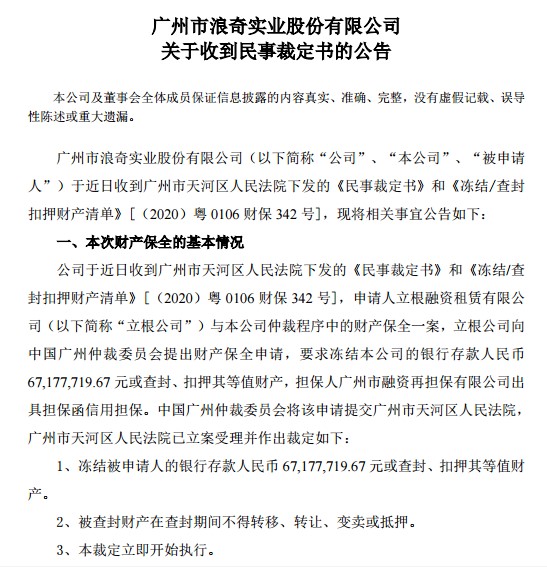 10月9日晚间,广州浪奇对外发布公告称,公司于近日收到广州市天河区人民法院下发的《民事裁定书》和《冻结/查封扣押财产清单》,申请人立根公司与公司仲裁程序中的财产保全一案,立根公司向中国广州仲裁委员会提出财产保全申请,要求冻结本公司的银行存款人民币6718万元或查封、扣押其等值财产,广州市天河区人民法院已立案受理并作出裁定,裁定立即开始执行。