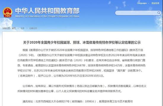根据《教育部办公厅关于做好2020年全国青少年校园篮球、排球特色学校遴选等工作的通知》、《教育部办公厅关于做好全国青少年校园冰雪运动特色学校及北京2022年冬奥会和冬残奥会奥林匹克教育示范学校遴选工作的通知》要求,在有关单位自主申报、省级教育行政部门推荐、专家遴选,教育部拟认定篮球体育传统特色学校2687所,排球体育传统特色学校1425所,冰雪体育传统特色学校1027所,北京2022年冬奥会和冬残奥会奥林匹克教育示范学校208所,校园篮球“满天星”训练营28个。