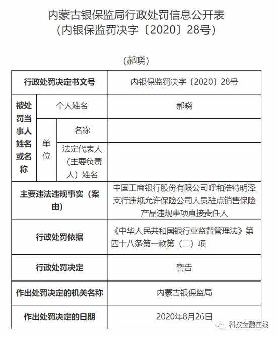 建行被处罚支行是呼和浩特锡林南路电力支行,被罚款30万元。工商银行出事支行发生在呼和浩特明泽支行,郝晓作为直接责任人被给予警告处罚。