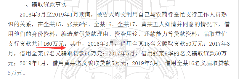 据刑事判决书显示,2016年3月至2019年1月期间,被告人周文利用自己与农商行蚕忙支行工作人员熟识的关系,在全某15、张某9华、全某16、全某17、黄某五人知情并同意的情况下,借用他们的身份资料,编造虚假贷款理由、资金用途、还款能力等贷款资料,骗取蚕忙支行贷款共计160万元。