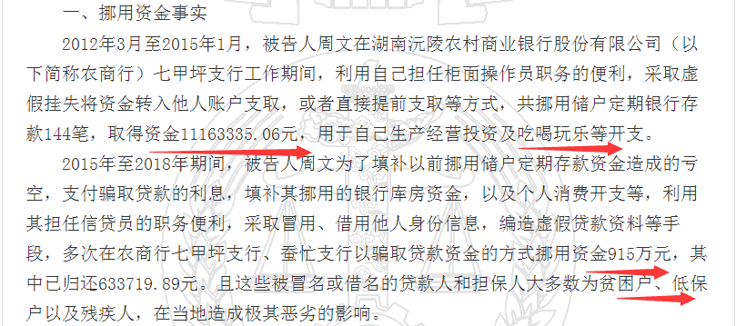 令人窒息的是,为填补以前挪用储户定期存款资金造成的亏空以及个人消费开支等,周文借用他人身份信息,编造虚假贷款资料等手段,多次以骗取贷款资金的方式挪用资金915万元。