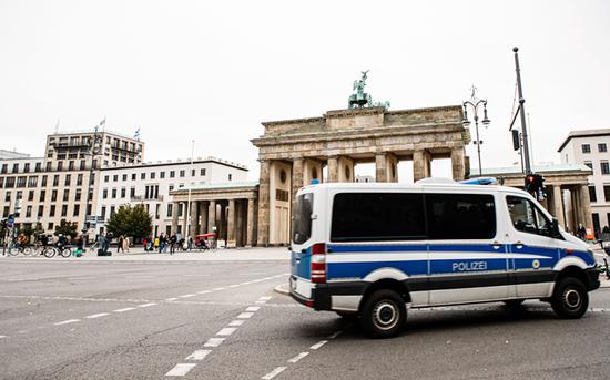 10月8日,在德国首都柏林,一辆警车从勃兰登堡门前驶过。新华社