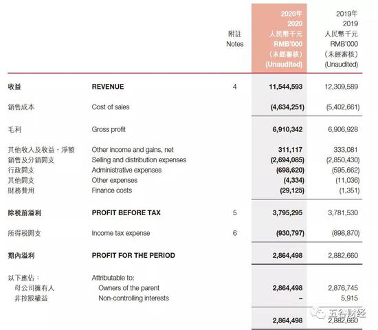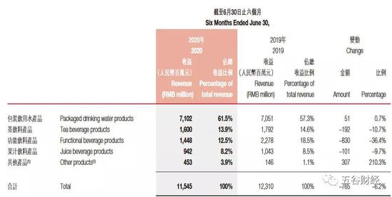 另外,受疫情影响以及因2020年农历中国春节较2019年相对较早,经销商已提前于2019年末备货,回顾期内,农夫山泉的果汁饮料产品与2019年上半年相比收益减少9.7%至9.42亿元。
