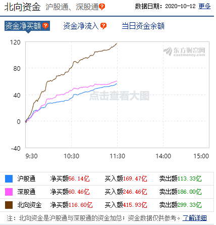 在普涨行情中,北向资金继10月9日净流入超100亿元后,12日仅上午净流入规模就已经超过100亿元,达116.60亿元。