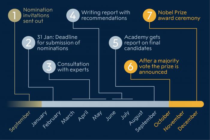 每年9月,诺贝尔经济学奖委员会向数千名科学家、学会成员和大学教授寄发邀请函,请他们提名下一年度的诺贝尔经济学奖的获奖候选人,瑞典皇家科学院院士与历届经济学奖得主也有提名权,不允许提名自己。被提名人选及评选意见直到50年后才能被公布。最终获奖者由瑞典皇家科学院投票选出,每届得奖人数不超过3人。