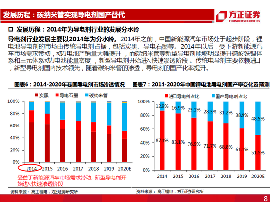 受下游新能源汽车市场需求带动,动电池产销量大幅提升,而碳纳米管等新型导电剂能够明显提升磷酸铁锂体系和三元体系动动电池能量密度,从2014年起碳纳米管逐渐渗透动电池市场,成为国内主流导电剂。