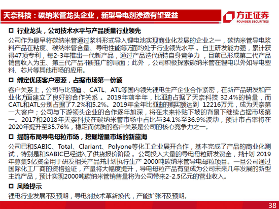 天奈科技的碳纳米管导电浆料在粘度、碳纳米管含量、导电性能等面均处于行业领先水平。公司自主研发能力强,每2-3年推出一代新产品,通过产品迭代保持自身竞争力;此外,公司积极探索碳纳米管在锂电以外如导电塑料、芯片等其他市场的应用。客户关系上,公司与比迪、CATL、ATL等国内领先锂电生产企业合作紧密,在新产品研发和产业化方面建立了良好的合作关系。