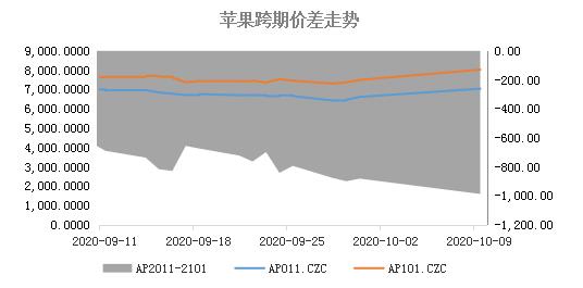 “双节”假期结束后第一天,苹果期货2101合约于10月9日当天下午封涨停8028元/吨,创近2个月以来2101合约最高点。截至10月12日,郑商所当日苹果期货合约前20名多头持仓64,307手,空头持仓62,942,净空持仓为1,365手;主力2101收盘报8,143元/吨,较节前涨幅达8.62%,跨期价差AP011-AP101在-988元/吨,价差持续扩大。