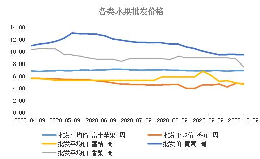 截至10月12日,批发市场苹果价格指数在115.475,环比出现上幅,全国富士苹果批发均价7.53元/公斤。据农业部监测数据,2020年第39周,重点监测的5种水果平均价格为5.55公斤,环比下降0.1%,同比下降5.2%。2020年第41周,苹果及其相关替代水果价格波动情况,富士苹果6.70 元/公斤(+0.06)、香蕉4.62元/公斤(-0.08)、巨峰葡萄7.53元/公斤(-0.25)、菠萝5.68元/公斤(-0.12)、西瓜3.55元/公斤(+0.08)。整体来看,近一周大部分水果价格环比略有下滑。随着天气转凉,市场水果种类逐渐减少,货量减少有利于苹果的销售。