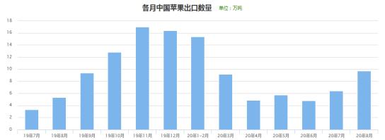 由于海外疫情一直未得到有效控制,对苹果需求影响较大,上半年国内出口量出现一定程度的下滑,从7月份开始,月度出口量才出现年内首次上幅。据海关总署数据显示,2020年1-8月苹果累计出口量为56万吨,略低于五年均值水平;2020年8月国内鲜苹果出口量9.7万吨,月度环比上涨51.56%。