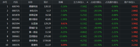 闻泰科技、京东方A、浙商证券行分别遭主力资金卖出7.50亿元、5.91亿元、5.25亿元。