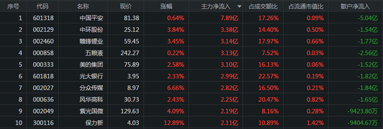 从个股来看,主力资金最青睐的3只股票分别是中国平安、中环股份、赣江锂业,流入金额分别为7.89亿元、3.38亿元、3.14亿元,所对应的涨幅分别为0.64%、3.84%、3.45%。