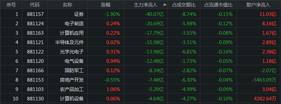 主力资金流出的板块分别是证券、电子制造、计算机应用,主力资金流出金额分别为40.07亿元、20.69亿元、17.79亿元,其中散户净流入金额为11.03亿元、8.16亿元、1.67亿元。