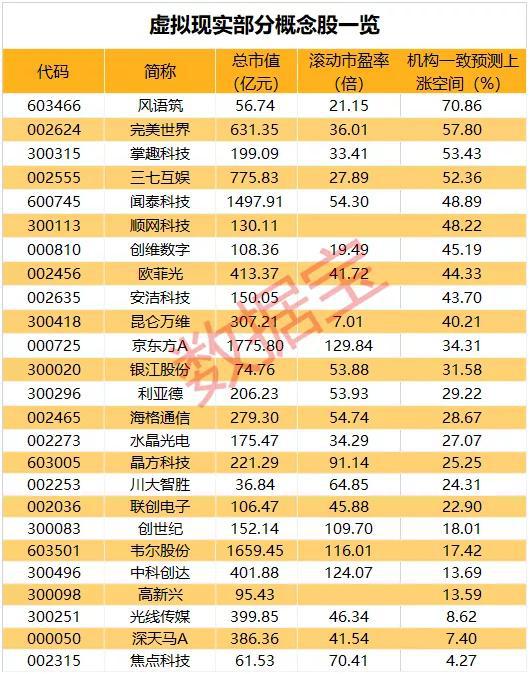 证券时报·数据宝统计显示,A股布局VR业务的上市公司共有47家,总市值过千亿元的有4股,分别为京东方A、韦尔股份、闻泰科技、歌尔股份。机构预测上涨空间超50%的有风语筑、完美世界、掌趣科技、三七互娱等股。