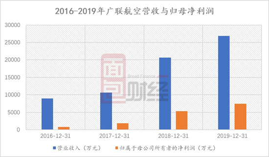 2017-2019年,广联航空分别实现营收10655.35万元、20639.44万元和26847.4万元;分别实现归母净利润1854.02万元、5296.27万元和7464.85万元,营收利润增长较为稳定。
