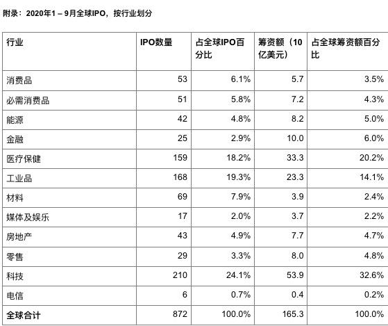 从行业来看, 科技、工业品和医疗保健行业依旧位居前列,分别有210、168和159宗IPO交易,筹资额分别为539亿美元、233亿美元和333亿美元。